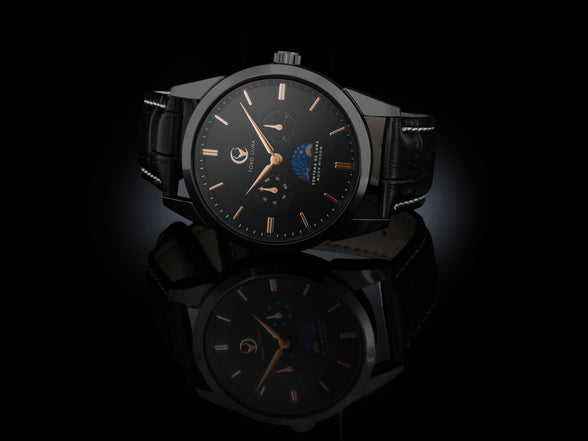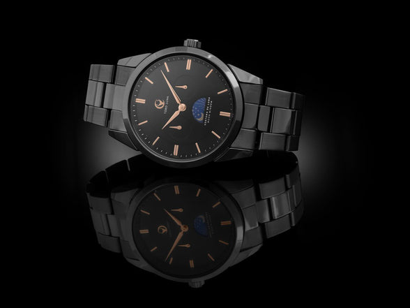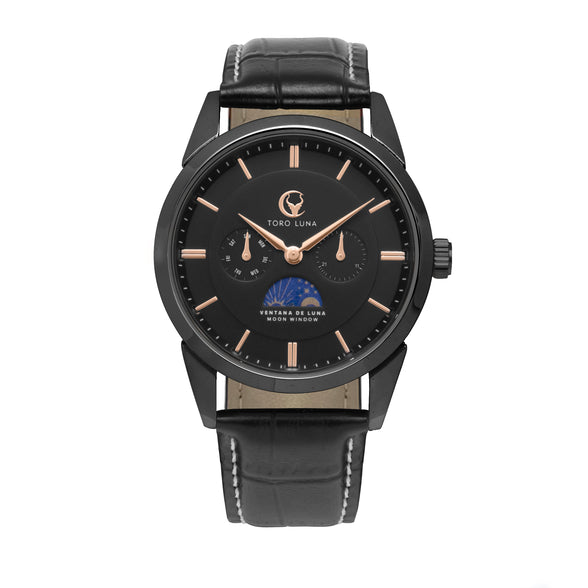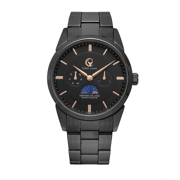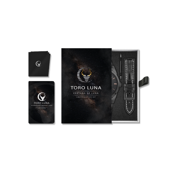 Toro Luna Apollo combines a versatile eye-catching aesthetic with ultimate performance. Enclosed within a high-polished metal casing is a multi-level dial that features a fully functioning sun and moon phase window. Unified by a stainless-steel band that can be easily adjusted to the wearer's wrist. Each timepiece comes packaged in a special edition gift set that is accompanied by a complimenting artisan leather band, took, and dust cloth.